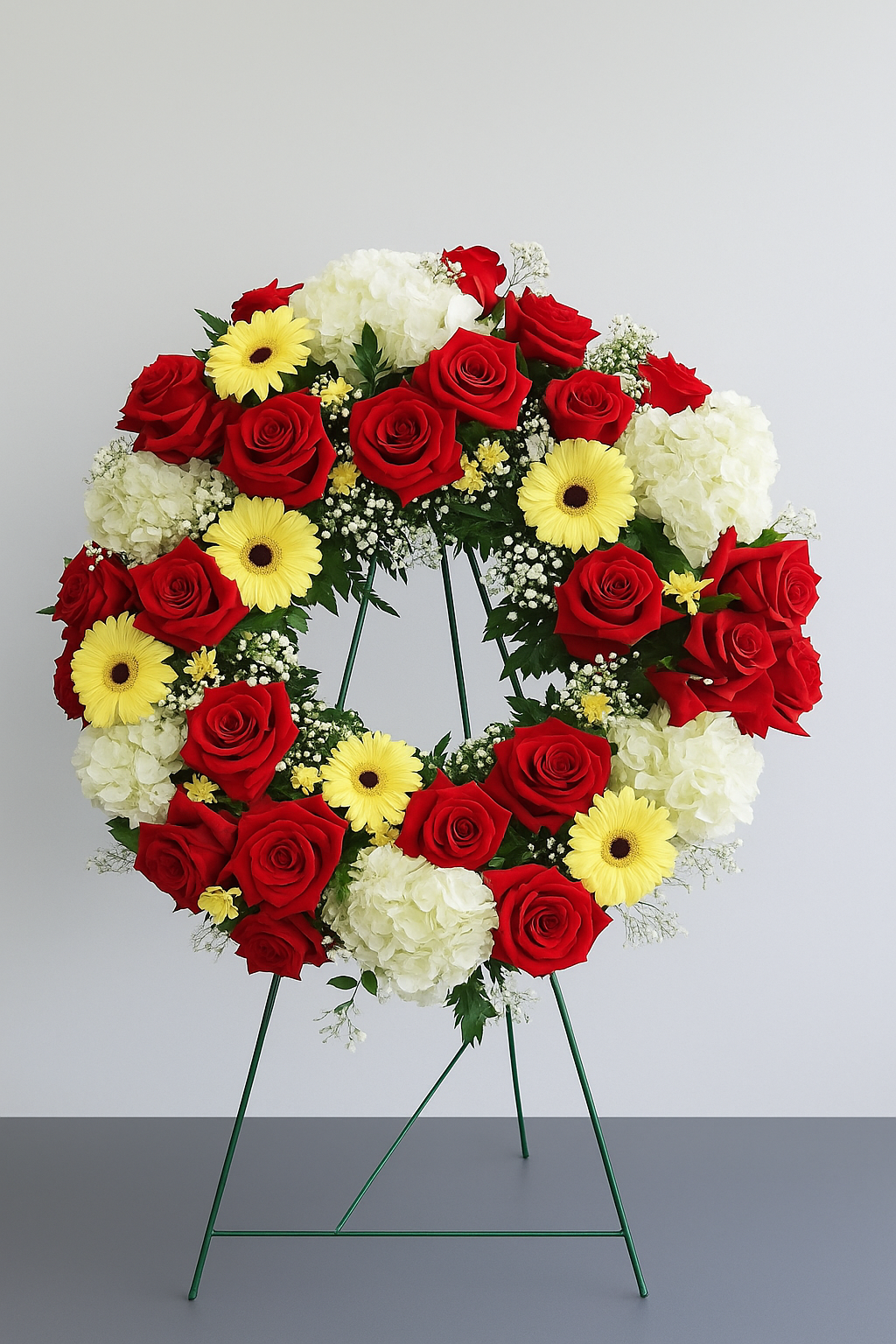 Honor a life beautifully lived with our Celestial Bloom standing wreath. Featuring vibrant red roses, soft yellow gerberas, and white hydrangeas, this elegant arrangement radiates warmth, love, and peace. Perfect for memorials and funeral tributes, it offers a graceful expression of sympathy and remembrance.