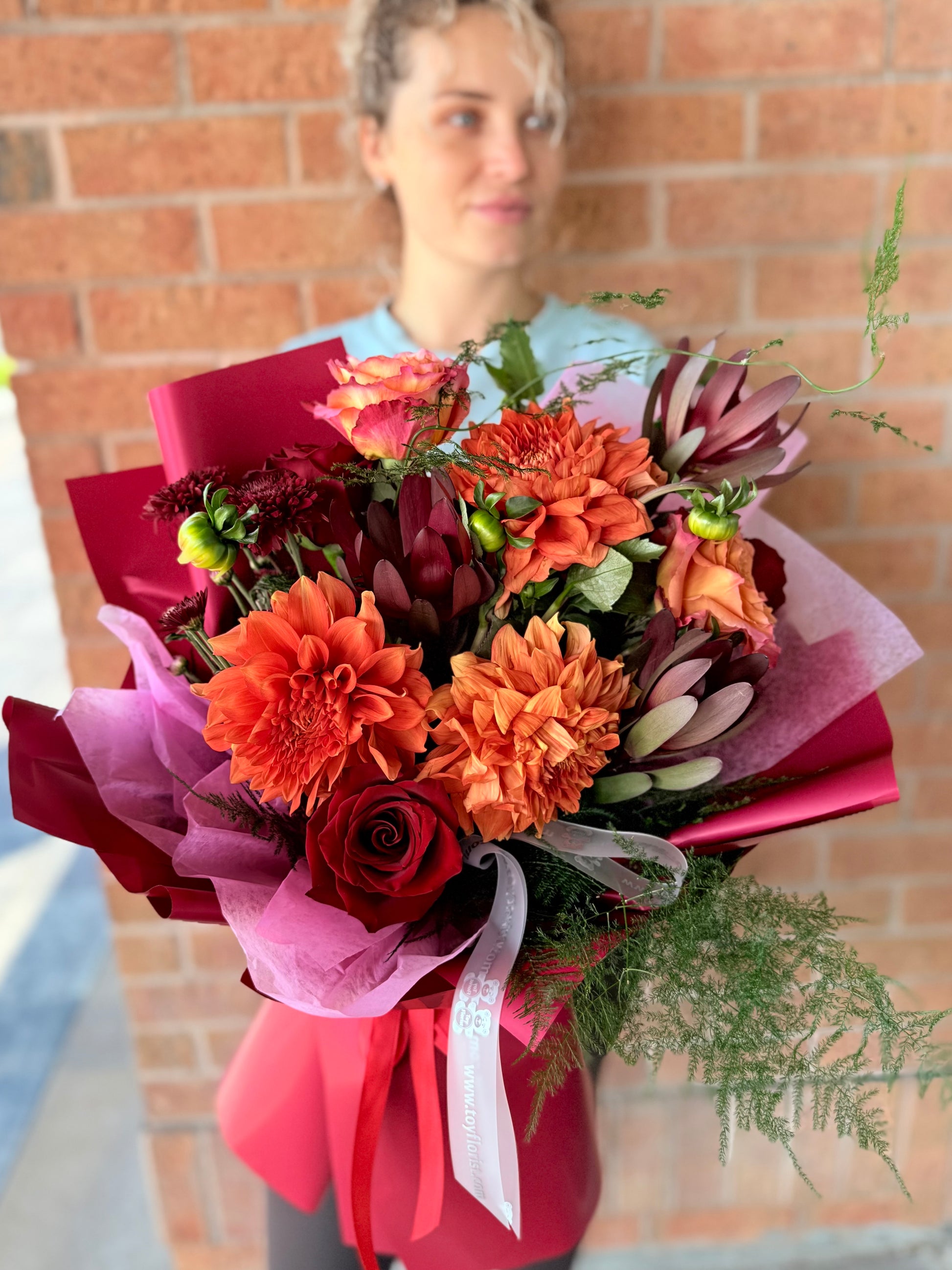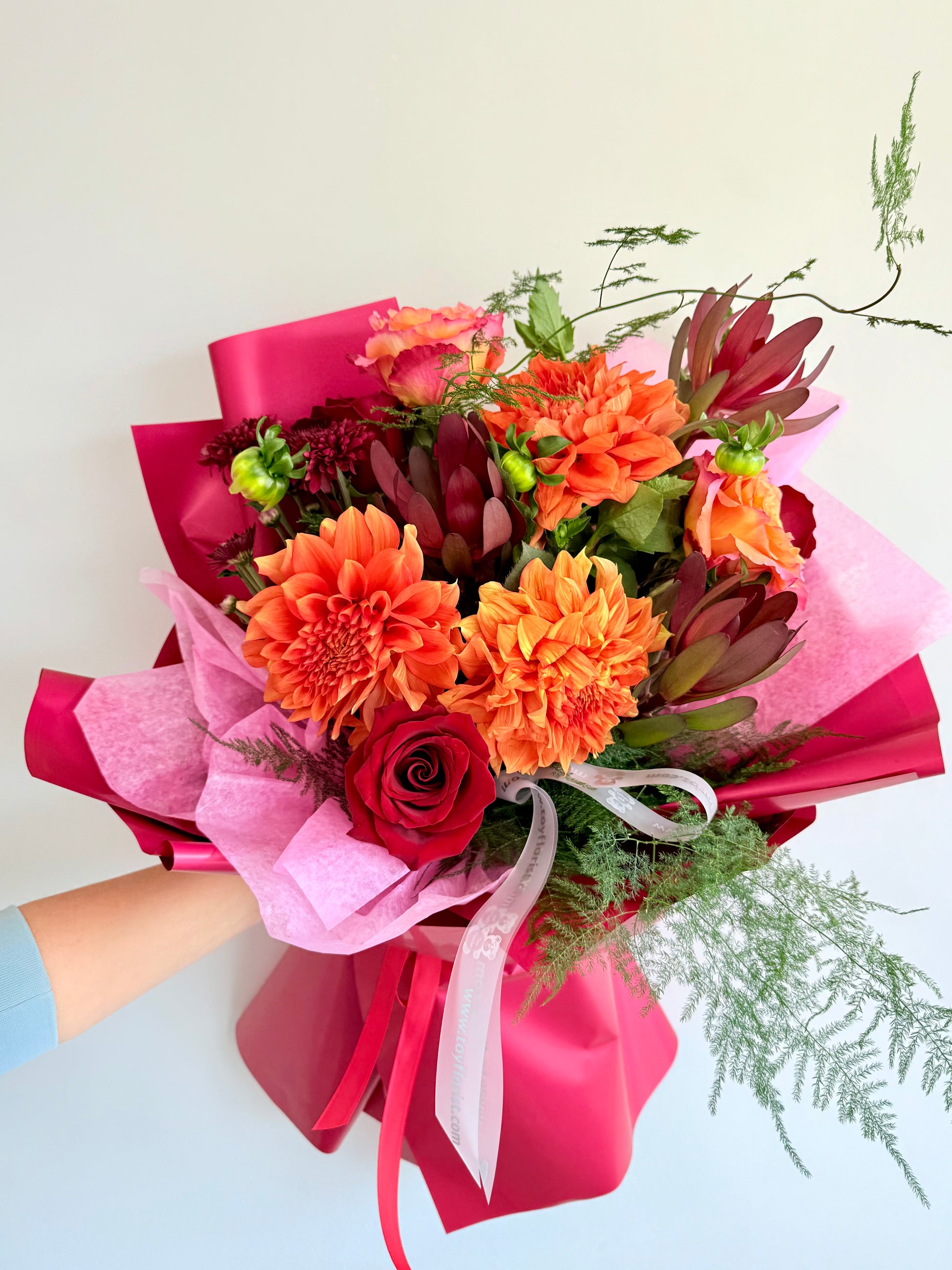 Bring the taste of autumn to life with Cranberry Sangria, a bold and vibrant bouquet of orange dahlias, deep red roses, and seasonal accents. Wrapped in rich crimson tones, this arrangement is perfect for fall celebrations, Thanksgiving tables, or gifting a touch of cozy elegance.