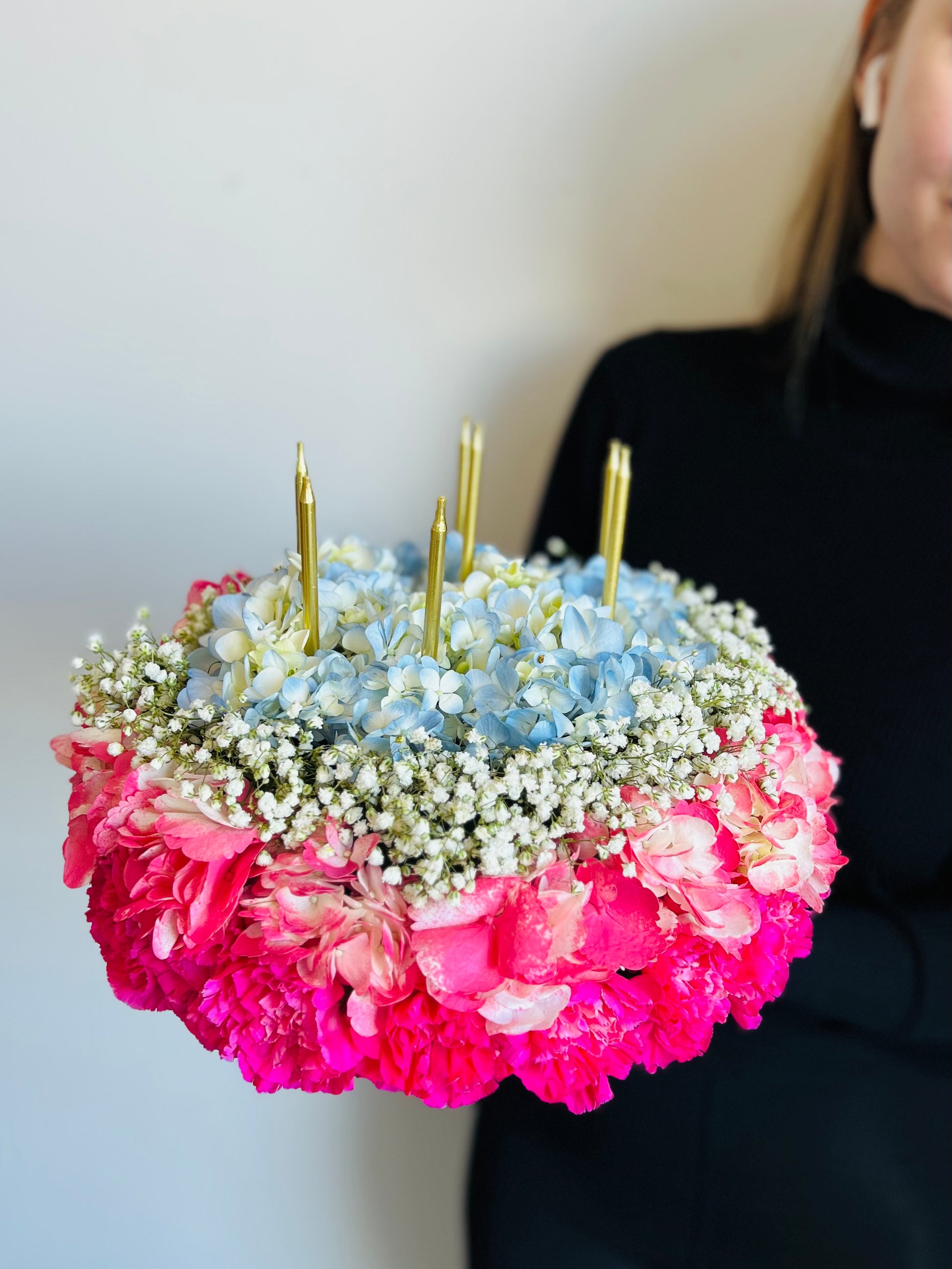 Make their special day unforgettable with our Happy Birthday Flower Cake, featuring vibrant pink blooms, delicate baby’s breath, and soft blue hydrangeas, finished with elegant gold candles. A unique fresh flower arrangement that brings beauty, joy, and celebration to any birthday. Same-day delivery available in the GTA.