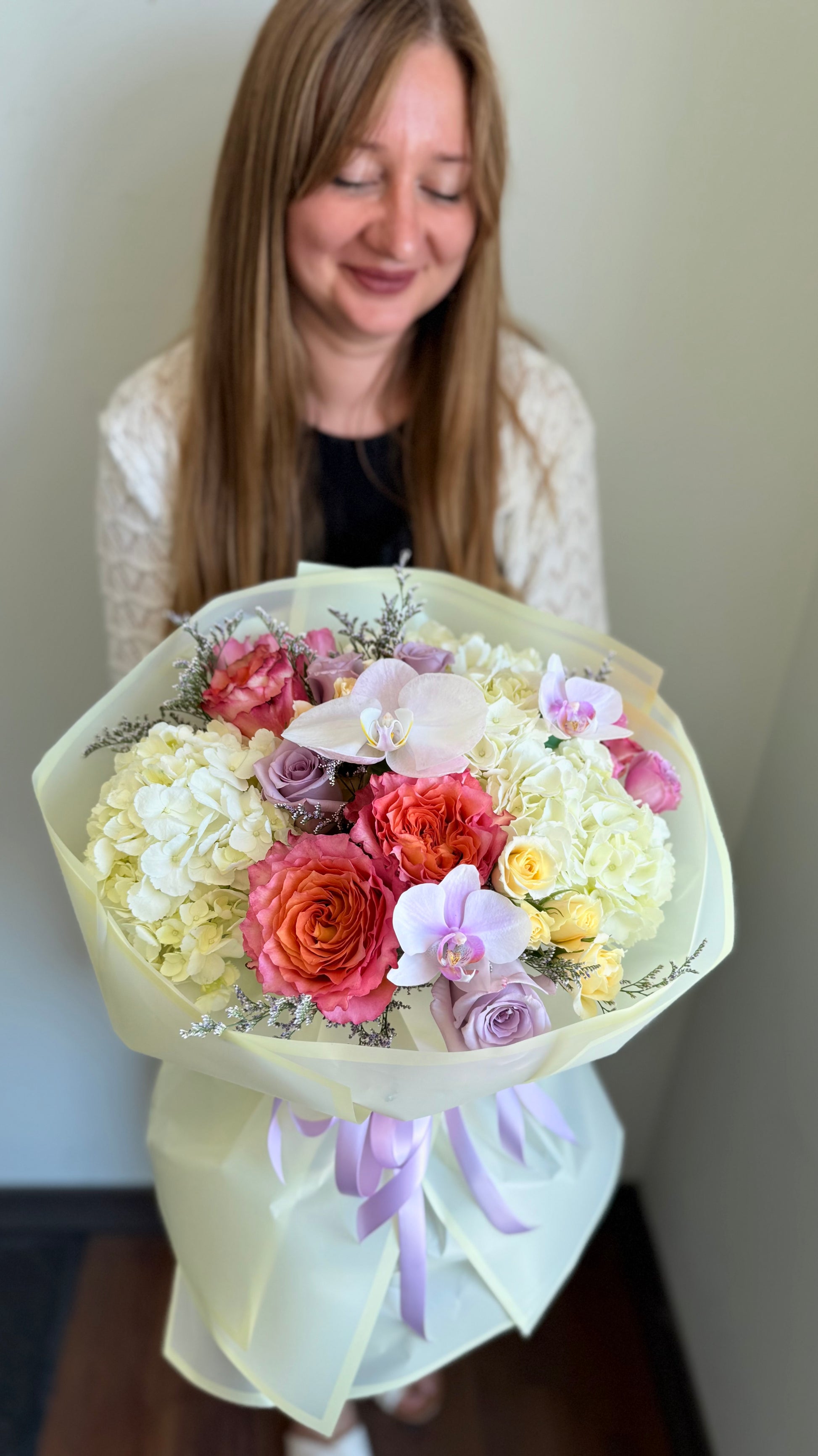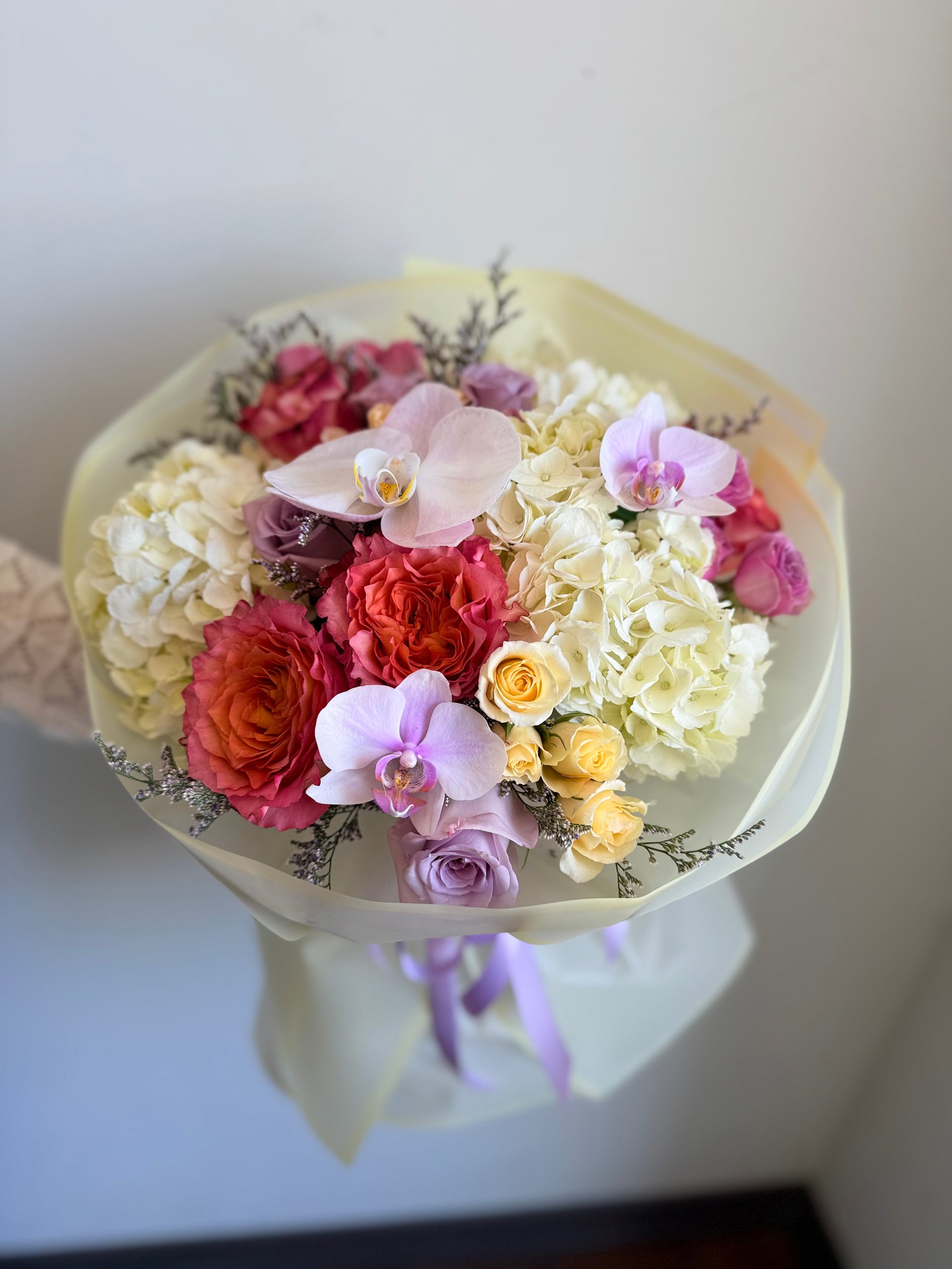 Hearts in Bloom is a romantic floral arrangement featuring lush white hydrangeas, vibrant garden roses in sunset tones, delicate lavender and blush roses, cheerful yellow spray roses, and cascading Phalaenopsis orchids in lilac and white. Wrapped in elegant ivory paper and tied with a satin ribbon, this bouquet is perfect for expressing love, gratitude, or celebration. Same-day flower delivery available across the GTA.