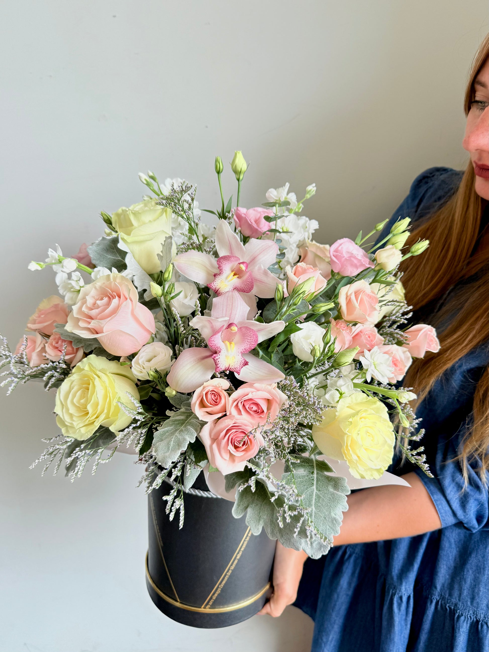 Pastel Dreams – A luxurious flower box featuring soft pink roses, creamy blooms, and pastel accents arranged in an elegant hatbox. Perfect for birthdays, anniversaries, or just because. Same-day delivery in [Your Location]. Order now for timeless beauty!