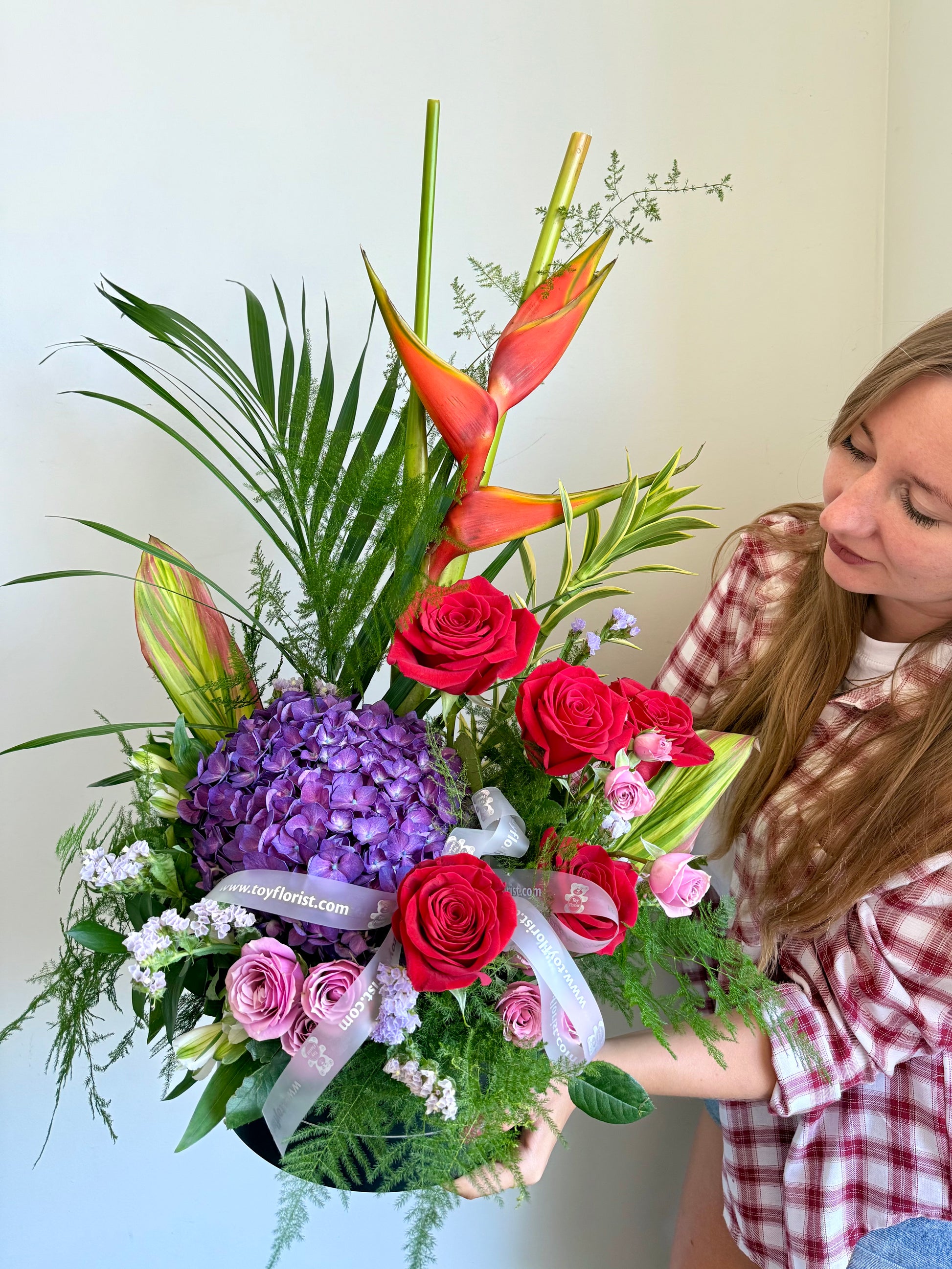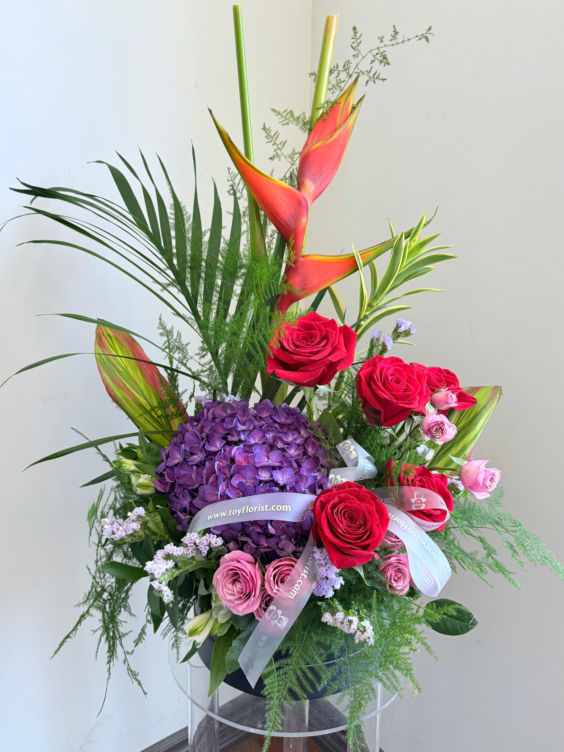 Bring happiness to any occasion with Pure Joy, a vibrant flower arrangement featuring lush purple hydrangea, radiant red roses, and delicate pink blooms. Designed with fresh greenery, this bouquet is perfect for gifts, celebrations, or brightening any space.