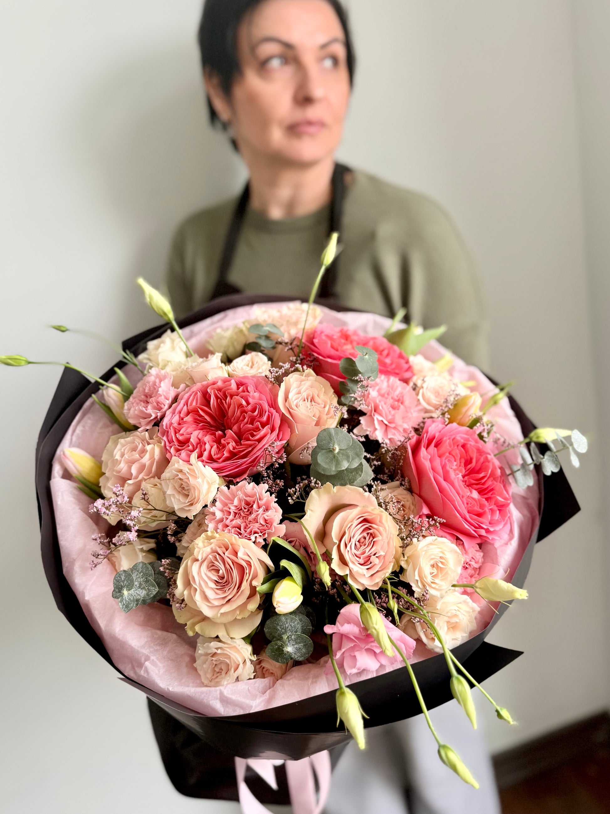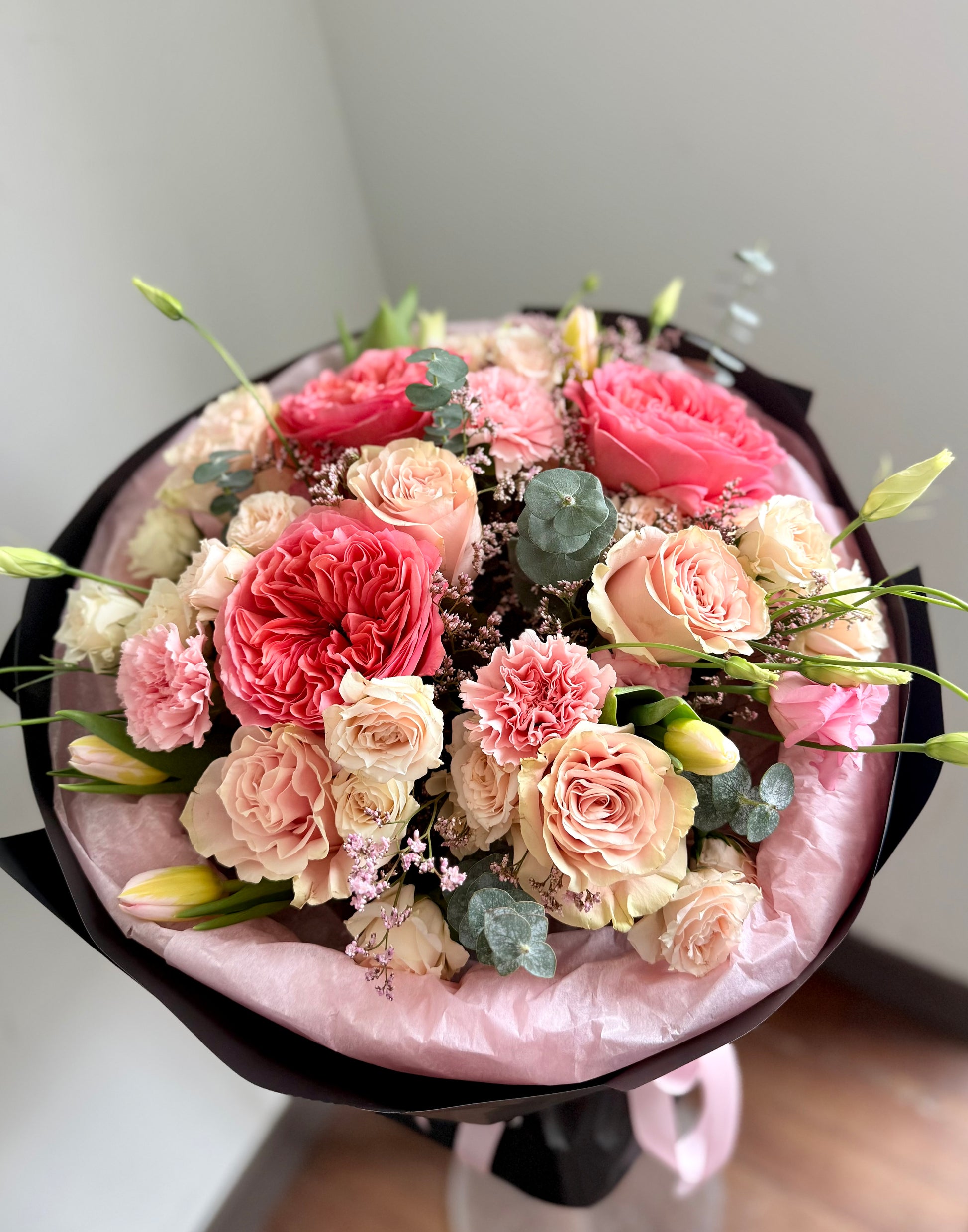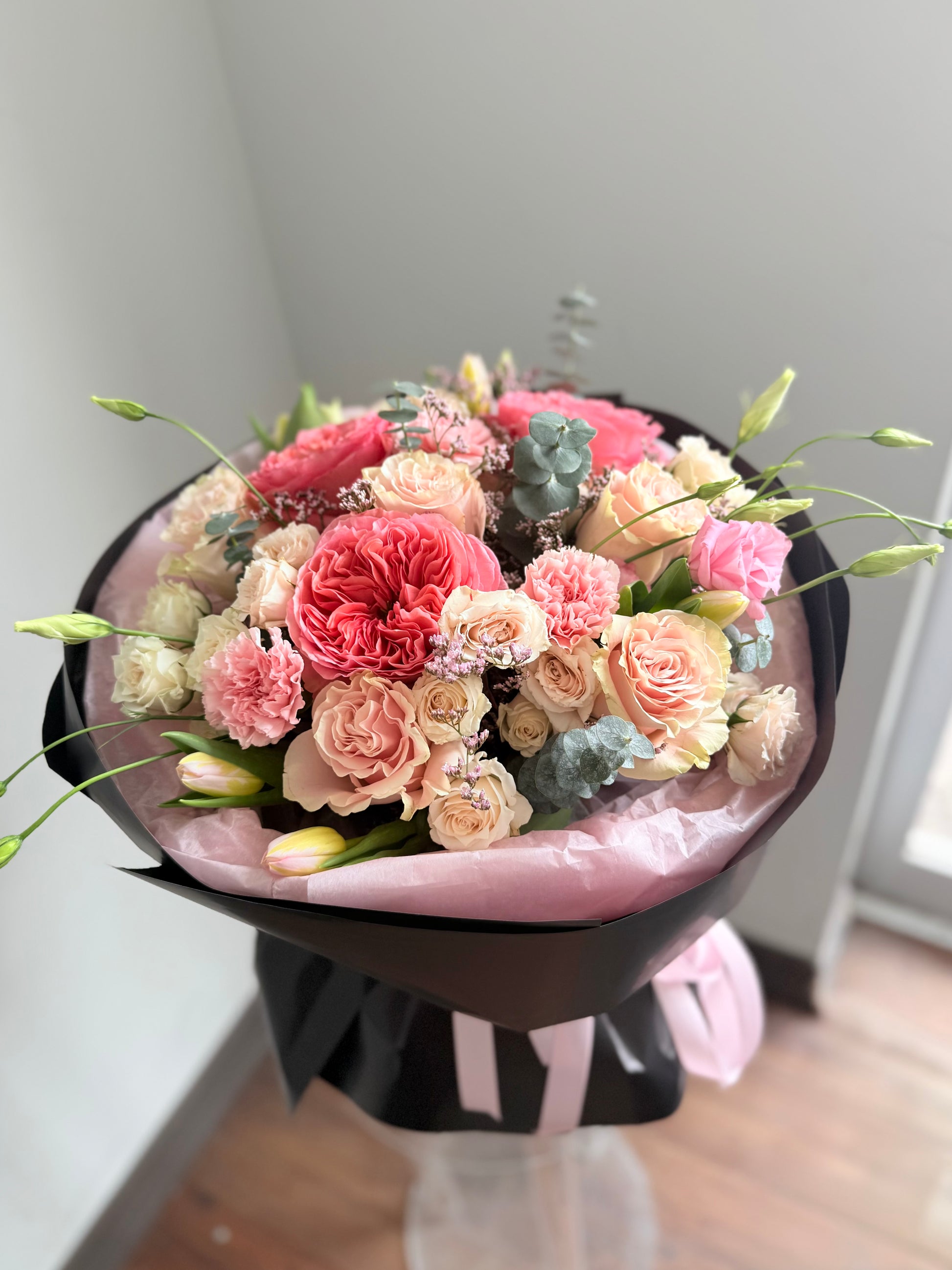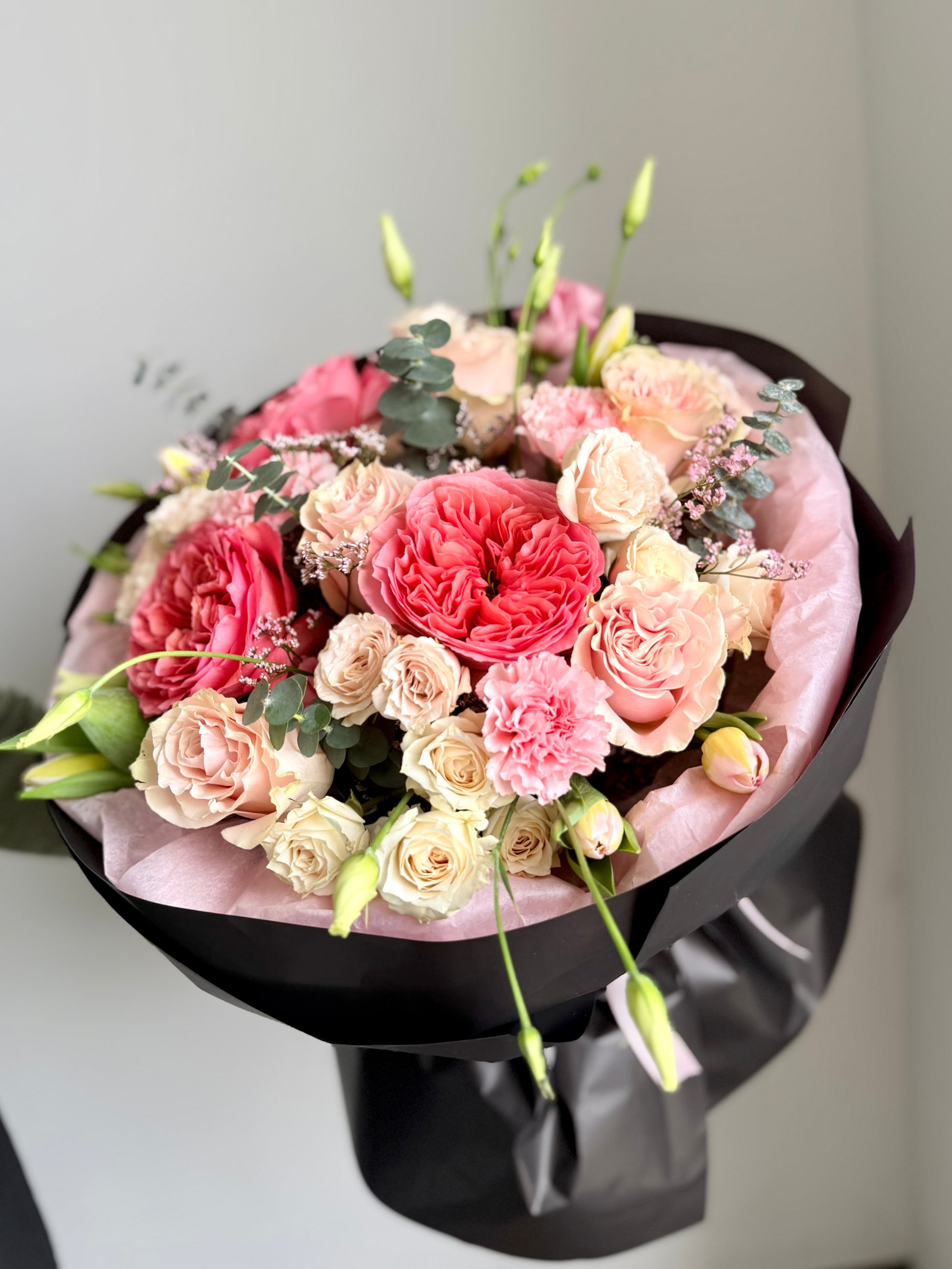 Rosé Dopamine is a vibrant, mood-boosting bouquet designed to spark instant joy. Featuring premium garden roses, spray roses, and delicate seasonal blooms in soft pink, peach, and cream tones, this arrangement blends elegance with a modern aesthetic. Wrapped in a sleek presentation, it’s perfect for birthdays, romantic surprises, or simply elevating someone’s day. Available for same-day flower delivery in Toronto, North York, Vaughan, and surrounding areas
