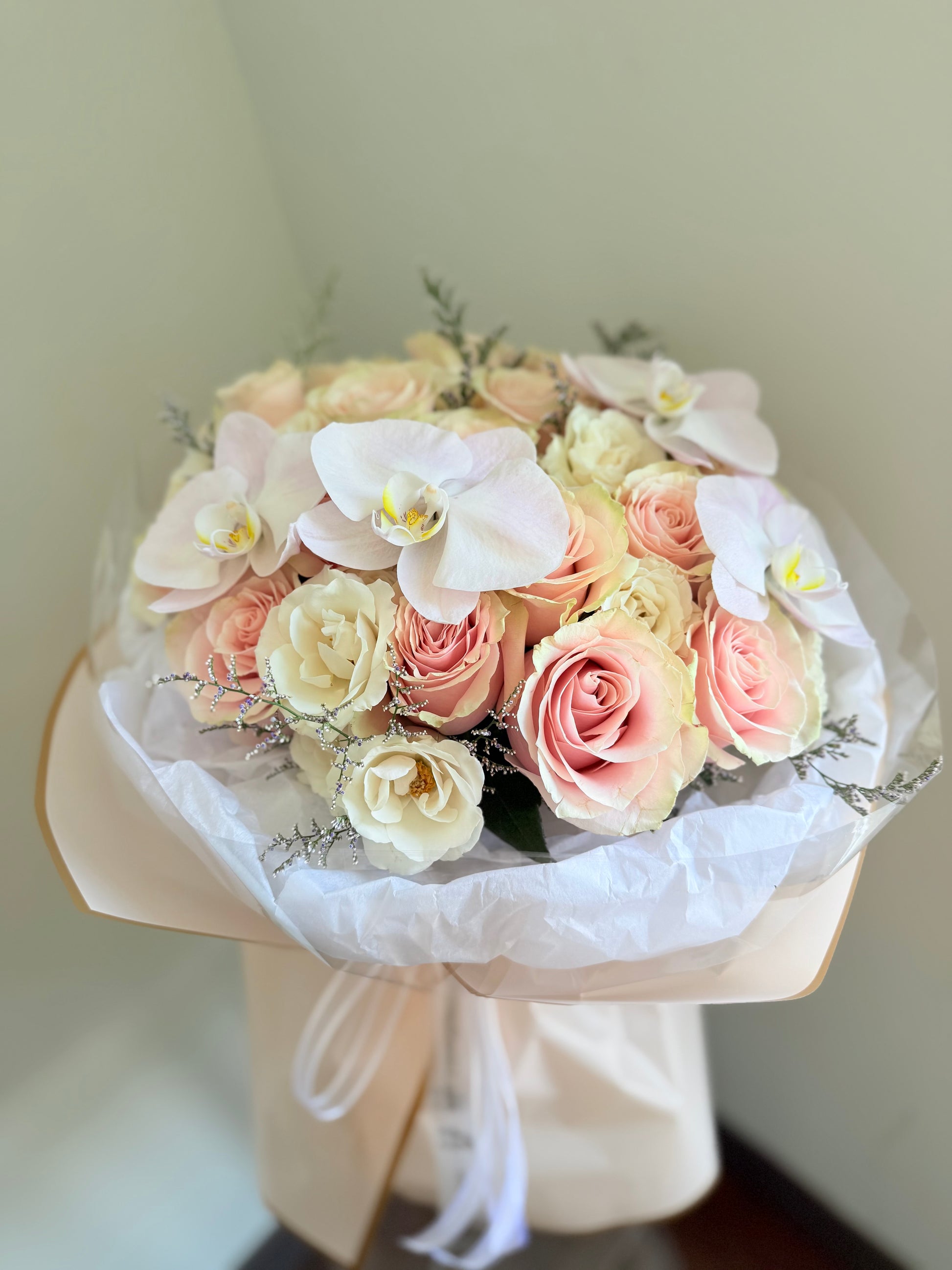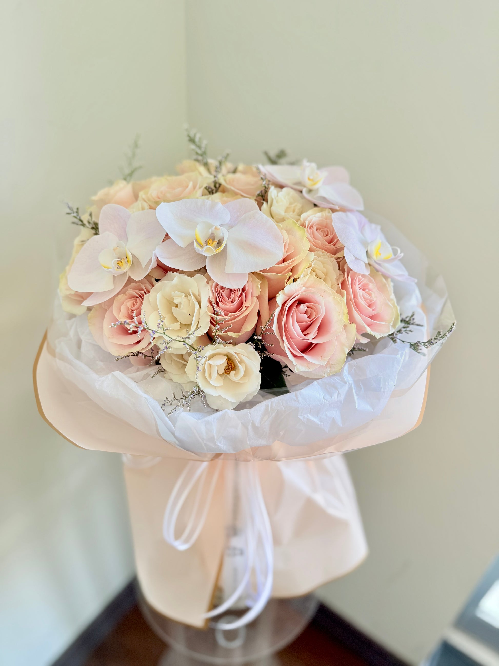 Rosélle is a delicate bouquet featuring soft blush and cream tones accented with elegant orchids, creating a timeless gift of beauty and refinement. Perfect for weddings, anniversaries, or any special occasion, this romantic arrangement blends luxury and grace in every petal. Available for delivery across Toronto GTA city, Rosélle makes every moment unforgettable.