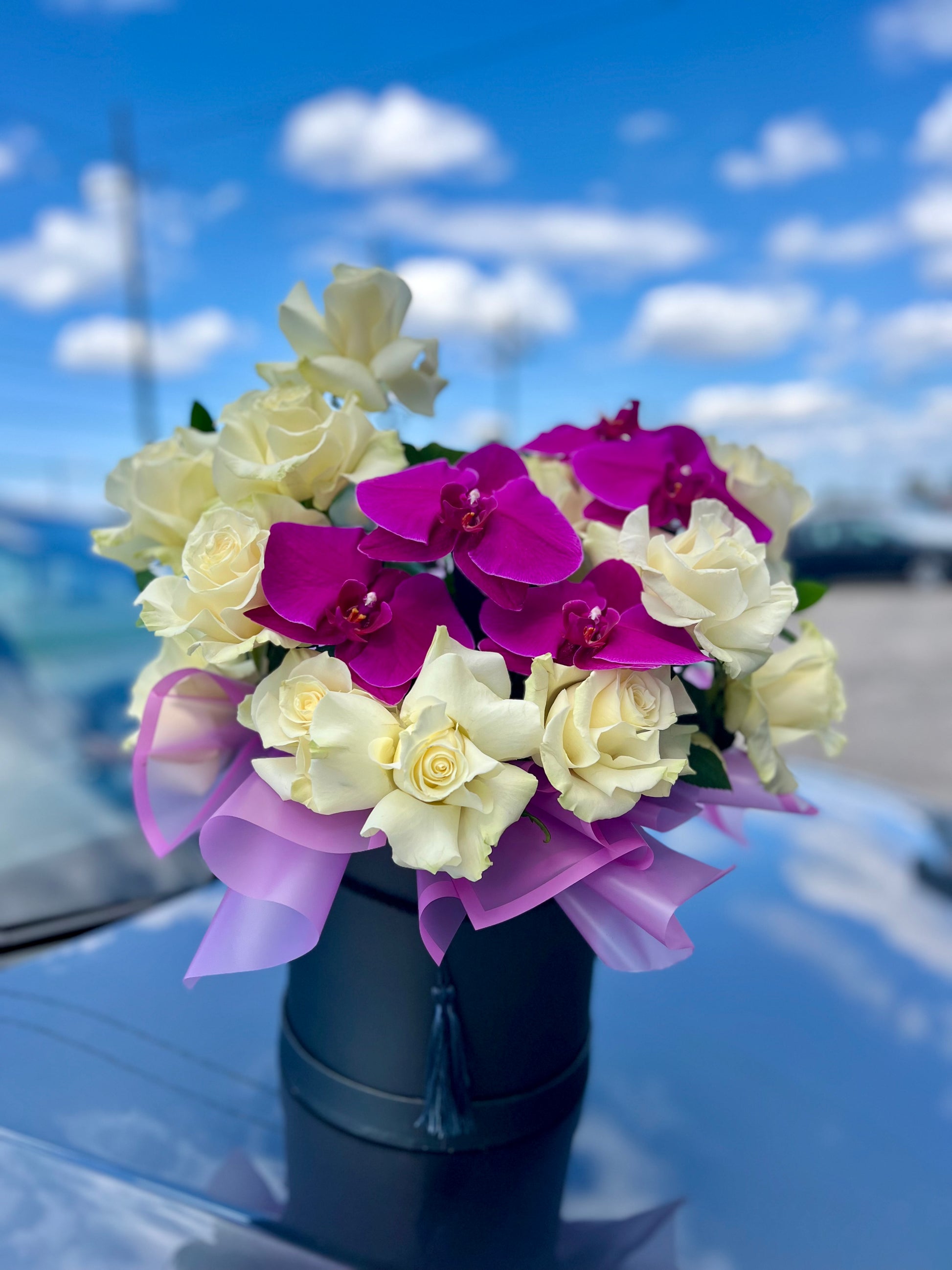 Introducing the "Secret Garden Flower Box," a breathtaking arrangement featuring elegant white French roses and vibrant purple orchids. This luxurious hatbox bouquet is perfect for adding a touch of sophistication to any setting. With same-day delivery available within the GTA, you can enjoy fresh, beautiful flowers at your doorstep in no time—order now to experience the charm of your own secret garden.