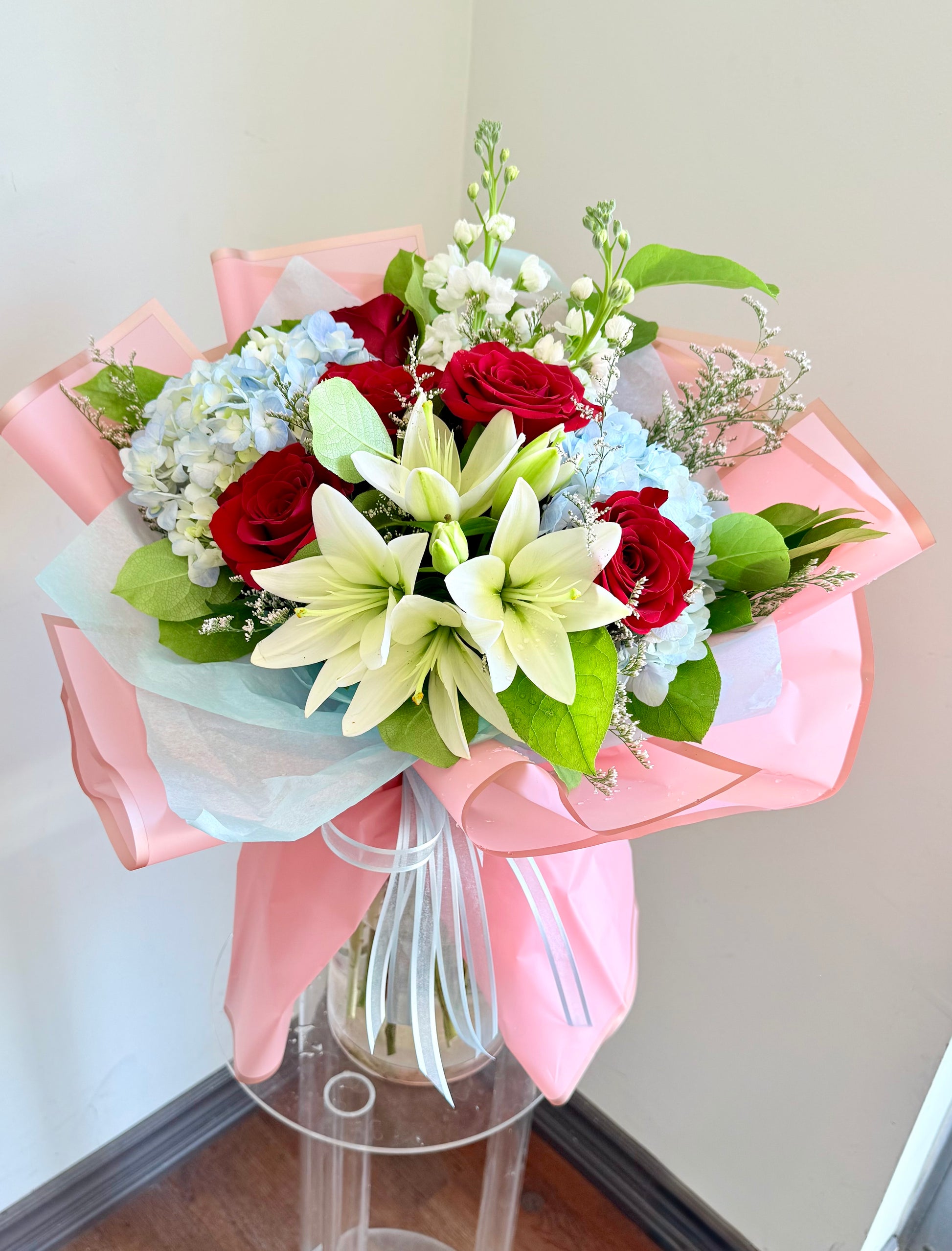 Elegant white lilies, vibrant red roses, and airy blue hydrangeas come together in our “Serenity Bloom” bouquet — a graceful design wrapped in soft pink with a dreamy pastel finish. Ideal for congratulations, thank-you gifts, or sympathy gestures. Same-day delivery across the GTA.